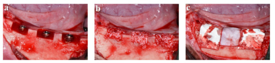 Surgical procedure to perform guided bone regeneration (GBR) in beagle dogs. (a) Implants placed in bone defect areas; (b) bone grafting; (c) membrane placement after bone grafting.
