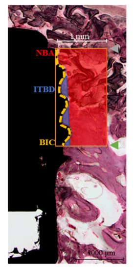 Histomorphometric parameters around the implants for analyzing new bone generation rates. The region of interest (orange rectangle) was set at a width of 1 mm, and height was defined as the distance from the implant platform and to the third thread of the implant fixture. NBA, new bone area; ITBD, inter-thread bone density; BIC, bone-to-implant contact; gray point, implant platform; green point, third thread of implant fixture; red area, NBA; blue area, ITBD; yellow line, BIC line.