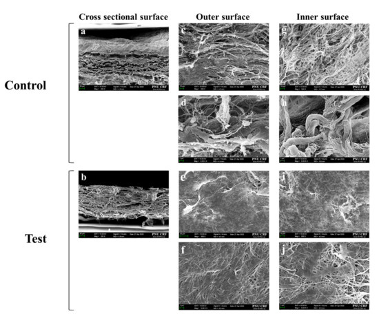 FE-SEM images of both membranes in three directions. (a,c,d,g,h) Non-cross-linked membrane; (b,e,f,i,j) cross-linked membrane. (a,b) Cross-sectional surface images; (c,d,e,f) outer surface images; (g,h,i,j) inner surface image. Original magnifications: ×200 (a,b); ×500 (c,e,g,i); ×5000 (d,f,h,j). Control is represented by non-cross-linked collagen membrane; Test is represented by EDC-cross-linked collagen membrane.