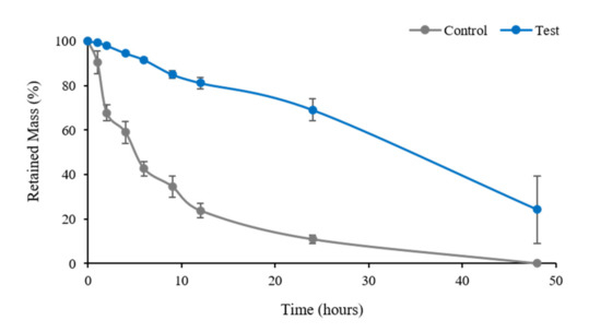 The results of enzyme resistance testing are shown in Figure 4. Control group membranes continuously degraded during testing and disappeared at 48 h, whereas Test group membranes degraded more slowly until 24 h and then degraded more rapidly. At 48 h, Test membranes were partially degraded. These results showed that the Test group membrane was significantly more resistant to enzymes than the Control group membrane (p = 0.043).