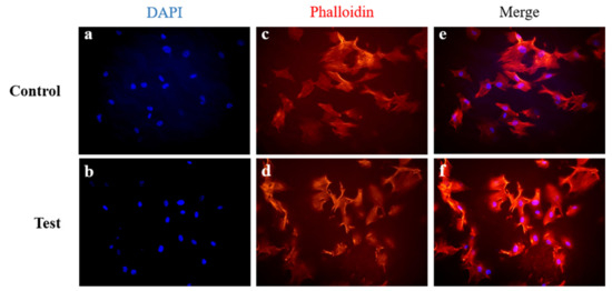 Immunofluorescent staining of human gingival fibroblasts (hGnFs) on membranes 2 h after seeding. (a,b) DAPI staining of cell nuclei; (c,d) rhodamine phalloidin staining of F-actin; (e,f) merged image; (a,c,e) non-cross-linked collagen membrane; (b,d,f) EDC-cross-linked collagen membrane. Control is represented by non-cross-linked collagen membrane; Test is represented by EDC-cross-linked collagen membrane.
