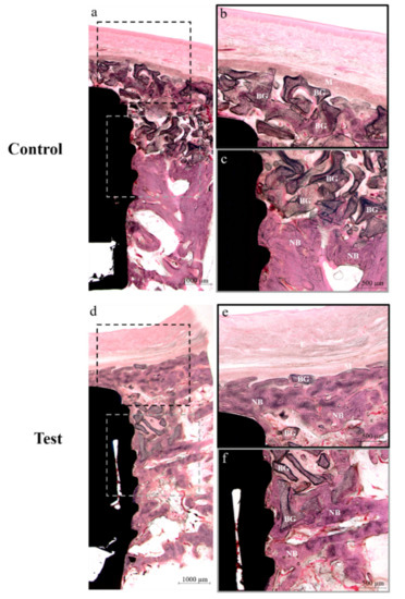 The results of histomorphometric analysis are summarized in Table 4. New bone area (NBA, %) values (24.78 ± 12.15% and 23.46 ± 8.52%; p > 0.05), inter-thread bone densities (ITBD, %) (56.98 ± 12.68% and 42.68 ± 21.89%; p > 0.05), and bone-to-implant contact percentages (BIC%) (50.44 ± 11.19% and 48.24 ± 13.19%; p > 0.05) were similar in the Control and Test groups.