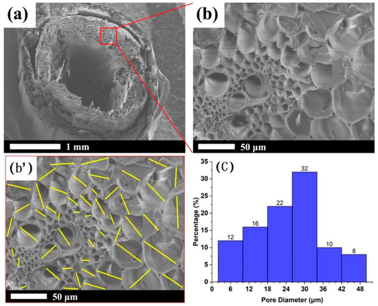 SEM micrograph of the straw core material: cross-section of single straw (a), partial enlarged detail (b), sampling tags of pore size for straw core (b’) and pore size distribution graph (c).