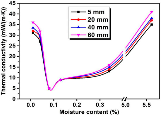 The straw with the maximum moisture (5.62%) possesses the maximum toughness, and its microstructure is easy to flatten with external pressure, as shown in Figure 10c. In the above two situations, the solid content is obviously increased under the same thickness, and their solid heat conduction is increased. For the situation of Figure 10b, the straw possesses the maximum compression to resist the external pressure because of the relatively low moisture (0.08%) content and appropriate toughness. In addition, the increase of the moisture leads to the continuous increase of the heat convection. Therefore, the sample with 0.08% moisture possesses the minimum thermal conductivity. The thermal conductivity of samples increases with the increase of the moisture.