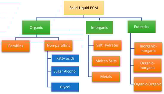 There were a large variety of classification standards for PCMs. Figure 2 shows a kind of explicit classification [21]. According to the phase of substances before and after the changing process, PCM could be roughly divided into solid–solid PCMs (SSPCMs), solid–liquid PCMs (SLPCMs), solid–gas PCMs (SGPCMs) and liquid–gas PCMs (LGPCMs). Among them, SLPCMs have the characteristics of large latent heat capacity as well as the small volume changing during the phase changing process, and easy access to raw materials, which puts it within the most common application field [22,23,24]. From Figure 2, as for PCMs that undergo phase change processing between a solid and liquid status called SLPCM, they could be generalized and classified into three main categories as organic, in-organic and eutectics.