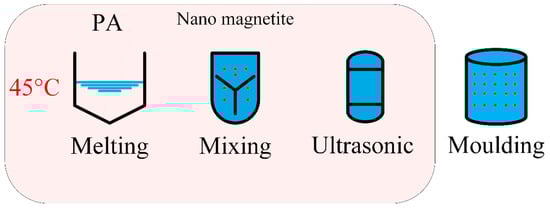 Although the thermal conductivity of metal oxide materials is significantly poorer than that of metals, its thermal conductivity is much higher than that of most PCMs. Therefore, researchers selected some metal oxides as additives to enhance the thermal conductivity of PCM. Sahan et al. [82] prepared PA/nano-Fe3O4 composite PCM by mixing nano-Fe3O4 by adding 10 wt % or 20 wt % sol-gel method into PA, respectively. The processing steps of the dispersion technique are shown in Figure 12. DSC results indicated that the latent heat of composite PCM was 8% higher than that of pure PA. In addition, due to the presence of 10 wt % Fe3O4 or 20% Fe3O4, the thermal conductivity increased by 48% and 60%, respectively. Babapoor et al. [83] prepared composite PCM by adding SiO2, Al2O3, Fe2O3, ZnO and the mixtures into PA and mixing them. Due to the presence of metal oxide particles, the thermal conductivity was significantly improved.