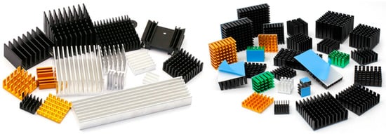 - Arshad, A.; Ali, H.M. Thermal management of electronics: An experimental analysis of triangular, rectangular and circular pin-fin heat sinks for various PCMs. Int. J. Heat Mass Transf. 2018, 123, 272–284. [Google Scholar] [CrossRef]