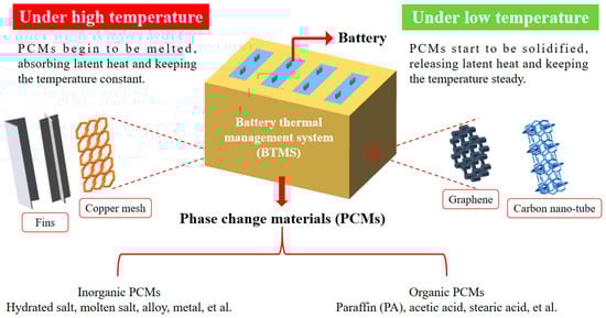 In summary, although many researchers focus on PCMs at present, there are insufficient systematic reviews summarizing methods for increasing the thermal conductivity. This work aims to provide a comprehensive summary of some related issues, such as the classification of PCMs, the methods to increase the thermal conductivity, and the application of PCMs in BTMS and some other fields. In this review, the characteristics, classifications and disadvantages of PCM were systematically described, and how to increase the PCM thermal conductivity was summarized, then the present main application fields of PCM were summarized. Finally, some existing problems about PCM were discussed. This review might bring new insights to the PCM application in the BTMS.
