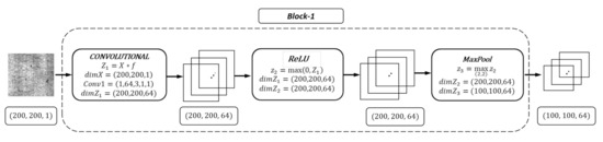 In Figure 2, we present the detailed structure of block 1 as an example since all blocks in the proposed ConCNN model (as shown in Figure 1) have a similar structure, i.e., each block has a convolutional and Pooling layer. In this case, we start with the input which is an image with 200 × 200 pixels and one channel. After applying the convolutional layer, we have a matrix with the dimension of (200, 200, 64). After applying ReLU function, we obtain a matrix with the same dimension (200, 200, 64) but with only positive numbers. Finally, we apply the pooling layer to the last matrix with the dimension of (200, 200, 64) to reduce its dimensional to a matrix with the dimension of (100, 100, 64) which is the input of the next block.