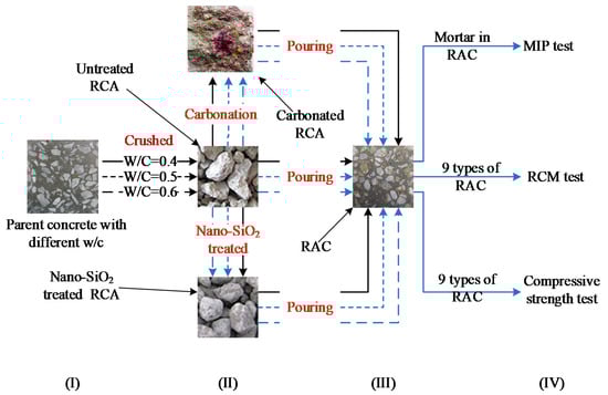 As illustrated in Figure 1, the experimental program used in this study involves four steps: (I) Properties of parent concrete with different water-to-cement ratios (W/Cparent) were characterized; (II) Parent concrete was crushed into RCAs, some of which was carbonated and nano-SiO2 slurry treated as new types of RCA, respectively; (III) Different types of RAC were prepared with nine types of RCA; (IV) The pore structure, diffusion coefficient, and compressive strength of RAC were measured experimentally.