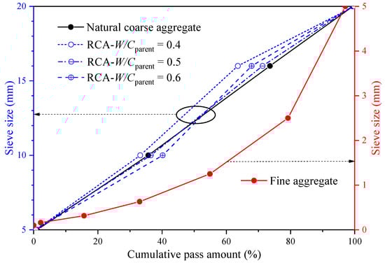 The recycled concrete is made of nine types of RCA with different properties. The unmodified RCAs are derived from the crushed parent concrete, which is derived from the abandoned natural aggregate concrete tested by the standard pressure testing machine in the laboratory. The age of parent concrete varies from 56 to 128 days. The water-to-cement ratios of the three kinds of parent concrete are 0.4, 0.5, and 0.6, respectively, and their corresponding compressive strengths are 45, 31, and 24 MPa, respectively. Silica fume and nano-silica have similar chemical compositions, and their combination is beneficial to the mechanical properties and durability of concrete [21,22]. Therefore, an appropriate amount of silica fume (SiO2 99.9%, particle size 2–10 μm) was used in the mix design. The mixture of parent concrete and recycled concrete is shown in Table 1; all of them used the same fine aggregate and cement. The volume fractions of RCA were the same for all types of RAC. The difference between them is mainly due to the different types of RCA and the amount of silica fume. The aggregate grading curves are shown in Figure 2. The cement used in this study was Portland cement (P.O 42.5), and its main components were C3S 55.7%, C2S 22.1%, C3A 5.1%, C4AF 16.8 and f-CaO 0.3%. The fine aggregate used was natural river sand, with water absorption of 0.83%, fineness modulus of 3.08 and apparent density of 2650 kg/m3. For parent concrete, the original natural aggregates used were limestone, with a diameter of 5–20 mm, apparent density of 2694 kg/m3 and water absorption of 0.85%, crushing index of 5.7%, and needle-like content of 6.7%. Both the coarse aggregates and fine aggregates used were in a saturated surface dry state. The concrete surface in the actual project is carbonated to varying degrees, but the carbonation depth of the concrete is only about 10 mm at the age of 50 years [23,24]. This means that most of the RCAs obtained by crushing the concrete in the actual project are not carbonated, similar to the RCAs obtained from the parent concrete.