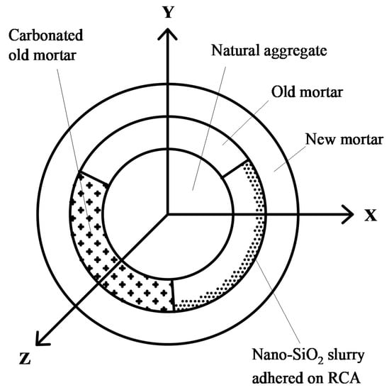 The mix proportion of nano-SiO2 strengthening slurry was cement 1183 kg, water 592 kg, nano-SiO2 24 kg, water reducer 18 kg and nano-dispersant 0.24 kg per m3. To obtain a suspension, nano-SiO2 and nano-dispersant were firstly added in water and then dispersed for 30 min by using the high-shear homogenizer (12,000 r/min, 300 W) and the ultrasonic disperser (40 kHz, 600 W). Next, nano-SiO2 suspension, cement and water-reducing agent were mixed for 6 min to obtain nano-SiO2 strengthening slurry. The air-dried RCAs were added to the nano-SiO2 strengthening slurry, soaked for 1 h, and stirred once every 5 min. Afterwards, the redundant nano-silica cement pastes were removed by using a square-hole sieve with a 4 mm edge length. Finally, the freshly prepared nano-SiO2 slurry-treated RCAs were evenly spread on a plastic film for 28 days with watering curing.