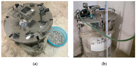 For the RCAs with three water-to-cement ratios obtained by crushing the parent concrete with three water-to-cement ratios, a third of the three types of untreated RCAs were carbonated for 7 d, according to Ref. [14,15], and another third of them were nano-SiO2 slurry-treated according to Ref. [16,17,18]. The RAC model and strengthening schematic diagram of RCA after carbonation and nano-SiO2 slurry treatment is shown in Figure 3, and the particle size of nano silica was 15 ± 5 nm. As can be seen from the figure, the carbonation process strengthens almost all of the old mortar, which is consistent with the experimental results of Poon [25]. For the silica solution wrapping method, only the surface of the old mortar can be strengthened, and it is difficult for the slurry to enter the inside of the old mortar, which is consistent with the experimental results of Zhang [16]. For RCAs that are not reinforced in the above two ways, the old mortar did not change significantly, as shown graphically in Figure 3. For the carbonation of RCAs, the RCAs were washed in water and were then spread evenly on the outdoor ground for air drying in sunny weather until the RCA moisture content was between 30% and 50%. According to Ref. [25], an air-tight stainless-steel cylindrical chamber with a volume of 75 L was used for the carbonation of RCA, as shown in Figure 4. To remove the excess evaporated water from the specimens during the carbonation process [26], an appropriate amount of silica gel desiccant placed at the bottom of the chamber; then, the RCAs were put into the chamber. The container was vacuumed to −50 kPa by a vacuum pump, then high-pressure carbon dioxide (CO2) gas with a purity of over 99% was injected into the container, which is similar to that in Ref. [26]. The pressure of CO2 in the container was controlled at 15 kPa during carbonation. The temperature of the room where the container was located fluctuated within a range of 19–24 °C (M8).