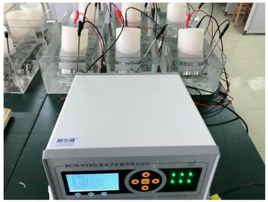 The details of the rapid chloride migration (RCM) test process corresponding to Figure 1 (IV) are described as follows: The RCM method proposed by Tang et al. [29] was applied in this work. The principle of this method is to generate chloride penetration through the sample by a solution concentration gradient and accelerate the movement of chloride using an electrical field. Since the thickness of concrete cover is generally less than 50 mm, it is reasonable to select 50-mm-thick samples for the chloride ion diffusion test. These sample disks with Ø100 × 50 mm were obtained from cylindrical samples using a cutting machine after curing for 28 days, and the cutting position was in the middle of the cylinder. The chloride migration test was performed on the sample disks, as shown in Figure 6.