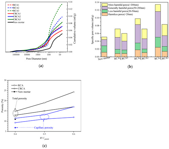 Pore structure of mortar in concrete: (a) cumulative curves of the pore size distribution, (b) pore volume distribution, and (c) porosity and capillary porosity of mortar.