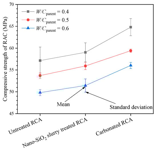 The 28 d compressive strengths of RAC containing different types of RCA are summarized in Figure 8. The legend “W/Cparent = 0.4” denotes the compressive strength of the RAC containing RCA resulted from the parent concrete with W/C = 0.4, as shown in Figure 1, and so on. It can be seen from the figure that the compressive strength of RAC varies from 50 to 65 MPa. The water-to-cement ratio of recycled concrete is 0.4, and the Portland cement is mixed with 10% primary micro silica powder, which can largely fill the micropore of concrete and improve the strength of concrete. For the same type of aggregate, the concrete compressive strength increases with the decrease of W/Cparent. Similar results can be found in Ref. [15]. In particular, the compressive strength of the concrete containing the untreated RCA with W/Cparent = 0.4 and 0.5 is 14.7% and 7.8% larger than that with W/Cparent = 0.6, respectively. The compressive strength of the concrete containing the nano-SiO2 slurry-treated RCA with W/Cparent = 0.4 and 0.5 is 14.8% and 8.7% higher than that with W/Cparent = 0.6, respectively. The compressive strength of the concrete containing the carbonated RCA with W/Cparent = 0.4 and 0.5 is 15.7% and 6% higher than that with W/Cparent = 0.6, respectively. The reason for this is that the properties of RCA resulting from the concrete with W/Cparent of 0.6 are worse than others, as shown in Table 2. For example, regardless of the treatment for the RCAs, the crushing value and porosity of RCAs resulting from concrete with W/Cparent = 0.6 are more significant than those with W/Cparent = 0.4 or W/Cparent = 0.5. The reason for this may be that the compressive strength of concrete increases with decreasing porosity [35].