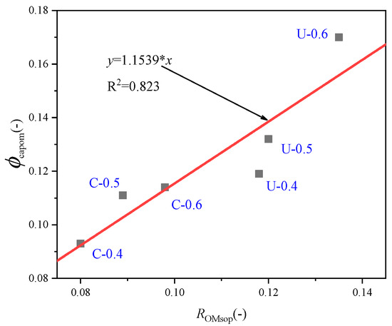 where, RsopRCA, RsopOM and RsopOA are the water absorption of RCA, old mortar and original natural aggregate, respectively. MwaterOM and MwaterInOA are the water content of old mortar and original natural aggregate in the saturated surface dry state, respectively. MRCA, MdryOM and MdryOA are the mass of RCA, old mortar and original natural aggregate in the dry state, respectively. ROM is the content of old mortar obtained by mass ratio, that is, the mass of old mortar divided by the mass of RCA.