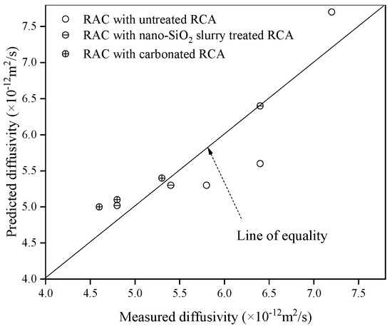 To determine the validity of Equation (12), it is necessary to calculate the undetermined coefficient according to the existing experimental data. For all types of RCA, = 6.8%, Vra = 40% and = 0.85%. Let = 0.18, ϕcrinm = 0.18 [47] and D0 = 2.03 × 10−9 m2/s based on Ref. [46], , , and Rom are shown in Table 2. The chloride diffusion coefficient of RAC is shown in Figure 9. By substituting the above data into Equation (12), the specific value of a corresponding to different concrete can be calculated. They are generally between 2.2 and 2.7. If the value a = 2.38 is selected as the specific value of Equation (12), the theoretical value of the chloride diffusion coefficient of different types of RAC can be calculated. The comparison between the theoretical value and the experimental value is shown in Figure 11. The results show that the theoretical prediction of chloride diffusivity in RAC is in good agreement with the experimental results. Therefore, Equation (12) can be used to predict and to perform parametric analysis.