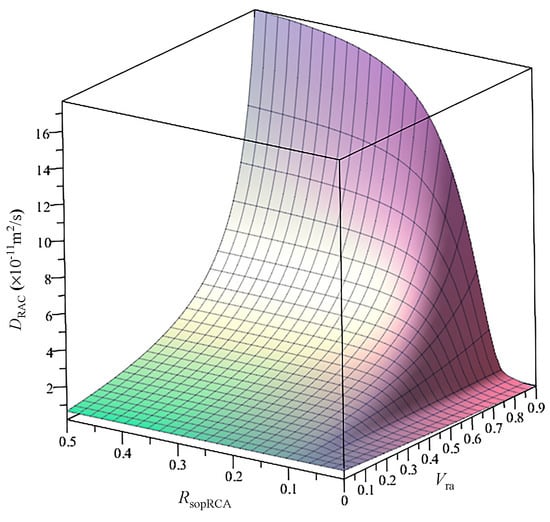 Since it is easy to determine , Rom and by experiments, their effect on the is analyzed by assuming = 0.38, = 0.07, a = 0.38, = 0.85%, kg/m3 and kg/m3 . Thus, is calculated using Equation (12), as shown in Figure 12. It can be seen from the figure that varies with and . For a given , increases with increasing and the speed of increase grows with increasing . When varies in the range from 0% and 6.2%, decreases gradually with increasing . When is larger than 6.2%, increases with increasing , and the increased speed of increases with increasing . For example, the numbers of DRAC (× 10−11 m2/s) corresponding to different and are shown in Table 3. This phenomenon can be explained as follows: in the process of crushing, due to the influence of internal damage, the porosity of mortar will increase [32], which can lead to increasing water absorption, while the water absorption of the original natural aggregate in the RCA is almost zero. Increasing the content of RCA can simultaneously increase the two phases of RCA and decrease the content of new mortar. When is small enough, chloride ions cannot easily diffuse in the RCA; increasing Vra can decrease the content of new mortar and the chloride diffusivity of RAC. When is large enough, chloride ions can easily diffuse in the RCA, while increasing Vra can increase the content of RCA and the chloride diffusivity of RAC.
