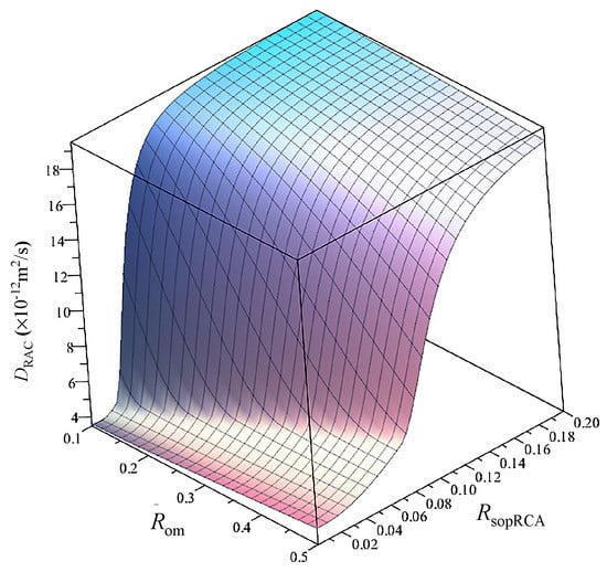 To analyze the effects of and on , = 0.4, calculated from Table 1, is used. The other parameters are the same as those in Section 4.2. Then the value of can be determined by using Equation (12), as shown in Figure 13. The figure shows that increases with increasing , and the increased speed is affected by . When is small, increases slowly and then rapidly with increasing . When is large, DRAC increases slowly over a long distance, and then becomes larger and more stable. For example, the numbers of DRAC (× 10−12 m2/s) corresponding to different and are shown in Table 4. This situation can be interpreted as increasing directly leading to an increase in the capillary porosity of the old mortar, and then results in increasing diffusion coefficient of old mortar. When increases by the same amount, the smaller the is, the faster the diffusion coefficient of the old mortar will increase, and then the faster will increase. As the content of RCA is constant, tends to be stable with increasing .