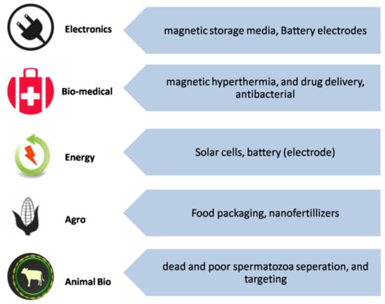Iron oxide nanoparticle (IONP)-based technologies are catalyzing rapid developments in nanotechnology. Due to technological importance, extensive research has been carried out on the development of various synthetic routes to yield IONPs with desired properties [1]. Among IONPs, mainly Fe3O4 and γ-Fe2O3 are extensively studied [2]. In general, iron oxides are classified into different phases (magnetite, hematite, maghemite, wustite). In the nano form, a material possesses interesting optical, magnetic, and electrical properties which cannot be found in their bulk form. This phenomenon can be described as the “quantum size effect” [3,4,5]. In the nanometer range of IONPs, the quantum effect dominates the behavior-affecting magnetic, electric, and optical properties of the matter. In the nanoscale, there is an impact of specific individual atoms or molecules, while in the bulk form, property is attributed to the average of all the quantum forces that affect all of the atoms. For example, magnetic Fe3O4 nanoparticles are superparamagnetic below the size of 20 nm [6]. As the nanoparticle size decreases, this property tends towards paramagnetic or superparamagnetic magnetization. Therefore, a decrease in nanoparticle size will enhance superparamagnetic behavior and decrease ferromagnetic behavior. As the size of nanoparticles decreases, the relative oxygen concentration decreases; therefore, a slight reduction in the iron valance state occurs. Because of this ferrous ion content increase, an increase in magnetization should also be observed [7]. Similarly, γ-Fe2O3 nanoparticles have gained technological importance due to their magnetic and catalytic properties. High magnetization and hysteretic heating make them potential candidates in separation and biomedical areas, and the semiconducting property and chemically active surface allow catalytic activities such as photocatalytic ability [8,9]. Iron oxide nanoparticles (IONPs) have a broad range of significant applications in electronics [10,11], biomedicine [12,13,14], energy [15,16], agriculture [17,18], and animal biotechnology [19,20], as shown in Figure 1. In a small size of about 10–20 nm, the superparamagnetic properties of Fe3O4 and γ-Fe2O3 nanoparticles become apparent, therefore, better performance can be achieved for the above-mentioned applications. Additionally, due to the increased surface-to-volume ratio, they show excellent dispensability in solutions [21].