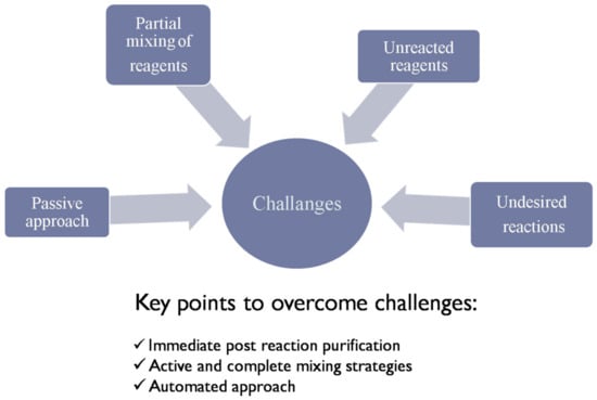 However, reproducible synthesis of IONPs with desired properties is still a problem [22]. This is because existing synthesis methods show a passive approach towards synthesis reaction. The main challenges and key points to overcome them are explained in Figure 2. In existing methods, reactants are mixed partially and passively. Unreacted components therefore effect the final product when undesired reactions takes place, as the proportion of all these factors is different in every reaction, making it difficult to achieve reproducibility in the desired properties [23]. Immediate purification of nanoparticles after reaction becomes necessary to minimize error. Direct active and complete mixing of reactants and automated approaches could solve this issue. Researchers are mainly focused on size- and shape-controlled synthesis, as size determines the surface area, which plays a key role in its exploitation for scientific or technological purposes [24].