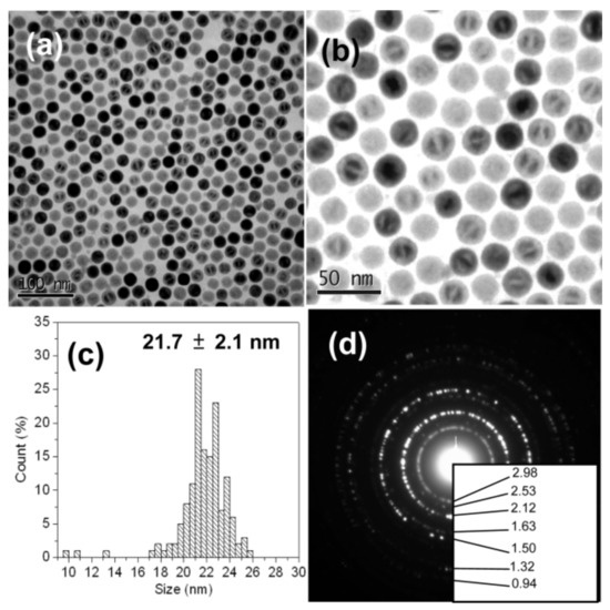 (a,b) TEM of FeO nanoparticles synthesized by thermal decomposition, (c) particle size distribution plot, (d) SAED pattern. Obtained permission from Ref. [53]. Copyright 2010 American Chemical society.