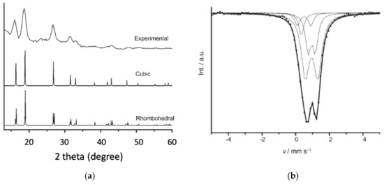 The XRD spectrum was obtained by the sample irradiated with molybdenum Ka radiation (0.71069 K) with a dedicated diffractometer. The Mössbauer spectrum was obtained by a Wissel MR360 transducer (a Wissel DFG1000 function generator and a Canberra meter with 25 mCi57Co source embedded in rhodium matrix). XRD patterns of FeO nanoparticles with peaks of experimental data, and cubic and rhombohedral phases are presented in Figure 5a.There is no significant difference in the peak positions for the cubic and rhombohedral phases; however, broadening of peaks due to small sized nanoparticles makes phase identification difficult. However it is possible to differentiate different FeO phase on the basis of cell parameters in XRD analysis [54,56].The asymmetrical broad doublet corresponding to nonstoichiometric FeO formation confirmed by Mössbauer measurements was carried out in zero field, as shown in Figure 5b, and it can be performed more accurately when the sample is not exposed to air. Mössbauer measurements are useful to study the magnetic structure and the phase state of the synthesized IONPs, and it is a much more sensitive technique than XRD. In the case of IONP analysis, the doublet in Mössbauer measurements signifies that the matrix consists of other atoms around Fe atoms or that the Fe atoms are not magnetically coupled. It also indicates oxide formation at the surface [49,50,54].