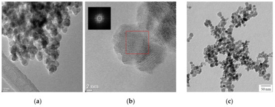 TEM: γ-Fe2O3 nanoparticles, (a,b), (c). Obtained permission from Ref. [67]. Copyright 2015 Elsevier, Obtained permission from Ref. [68]. Copyright 2014 Hindawi Publishing Corporation.