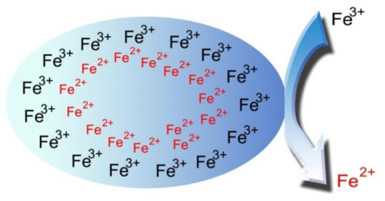 Magnetite nanoparticles were synthesized by the hydrolysis of Fe2+ ion and Fe3+ ion (mole ratio of 1:2) by a base (e.g., NaOH, KOH, NH4OH) [75,76,77]. During this, the overall composition of the precipitate was the same as that of the reaction system. However, since the hydrolysis rate of Fe3+ ions is greatly different from that of Fe2+ ions, the composition of the nanoparticle may not be the same [22,27]. At pH > 11, re-dissolutions of Fe(OH)3 and Fe(OH)2 begins: