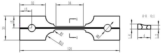 High-temperature tensile tests were conducted to explore the effects of welding speed on the tensile properties of weld joints. The tests were carried out with a electronic universal tester and electric heating furnace (Chanxin testing machine manufacturing limited company, Jinan, China). The specimens were heated to 900 °C and held for 5 min to ensure austenitized completely. Afterward, the tensile tests were carried out with a strain rate of 0.05 s−1. The samples were cut from TWBs in the direction parallel to the weld line. Figure 3 shows the geometry and dimensions of the tensile samples. The tests were repeated three times to verify the accuracy of the measurement data. For comparison, the tensile properties of the BM perpendicular to the rolling direction were also measured under the same deformation conditions.