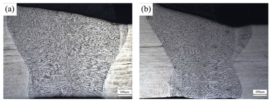 After etched by saturated picric acid, the shape of FZ can be observed by an optical microscope (Carl Zeiss AG, Analytik Jena, Germany). Figure 4a,b show the metallographs of FZ welded by different welding speeds. It can be concluded that the FZ transits smoothly from the thick side to the thin side, and no welding defects such as gas hole, inclusion, and crack can be observed. In addition, the inclination angle of the upper surface of FZ decreases with the reduction of welding speed. A previous study indicated that appropriate reduction of welding speed is beneficial to the smooth transition of sheet metal on both sides of the weld line, which can improve the formability of TWB [19].