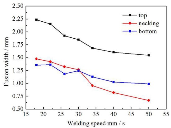 By observing the metallographs of weld joints, it can be found that the FZ presents an hourglass shape. Image processing software Image-Pro Plus (6.0) has been used to measure the width of FZ at the top, necking, and bottom position. Figure 5 shows the relationship between the width of FZ and the welding speed. It can be concluded that the width of FZ in these three positions decreases with the rise of the welding speed, and the reduction is more obvious in the necking position. Behzad et al. [20] summarized previous research, which investigated the influence of welding speed on the geometry of the FZ. The research results obtained by many scholars have confirmed that the increase of welding speed can reduce the width of the FZ, which is consistent with the measurement results in this paper. This phenomenon can be attributed to the change of heat input due to the variations of welding speed. The approximate value of heat input can be calculated by Formula (1).