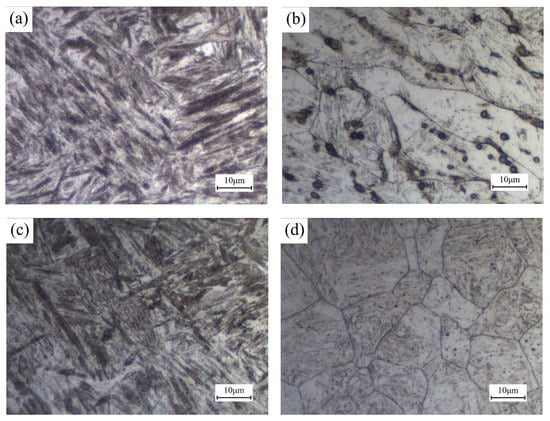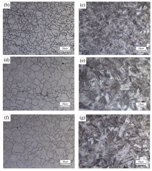 Figure 8c,e,g shows the metallographic structure of quenched weld joint in different regions. Through the comparison and analysis, it can be found that the FZ has smaller martensite compared with other regions, which is due to the limitation of grain size on the growth of martensite. For the same reason, the dimension of martensite in the BM is similar to that in the original HAZ.