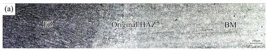 Since the heating temperature of CGZ and FGZ was above , the metals of the two regions were fully austenitized in the welding process and transformed into martensite in the subsequent rapid cooling process. The CGZ is adjacent to the FZ, the peak temperature of the thermal cycle experienced in the welding process is between the melting point, and the superheat temperature, which leads to the austenite grains of CGZ growing seriously, especially near the fusion line. Compared with the CGZ, the metal of FGZ was heated to a lower temperature, ranging from superheat temperature to , which decreases the growth tendency of grains in this region. The grain morphology of CGZ and FGZ is shown in Figure 7d,f, respectively. It can be observed that the grain size of FGZ is much smaller than that of CGZ. Fine austenite grains can limit the dimension of martensite. By comparing the metallographic structure shown in Figure 7c,e, finer martensite can be found in FGZ.