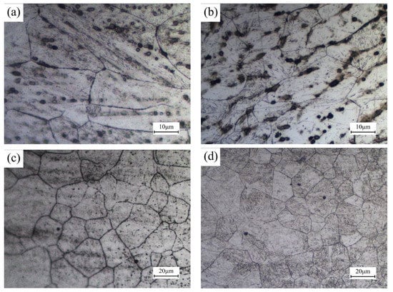 The analysis results shown in Section 3.2.2 indicate that the grain morphology of HAZ becomes uniform during the heating process. Figure 10a–d shows the grain morphology of FZ and original HAZ after quenching, which were welded under different welding speeds. It can be concluded that the welding speed has no noticeable effect on the grain morphology of quenched weld joints. During the heating process, the occurrence of recrystallization and grain growth eliminate the difference of grain morphology caused by the change of welding speed before heat treatment.