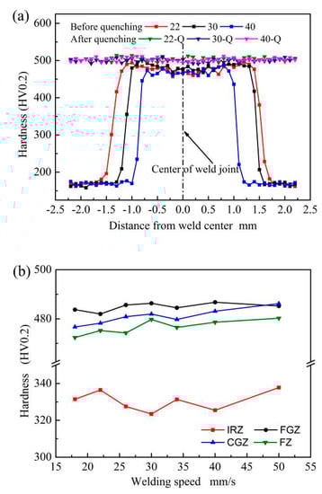 Figure 12a shows the hardness distribution curves of weld joints under different welding speeds before and after quenching. For the weld joints without heat treatment, the increasing of welding speed can reduce the width of the area with high hardness, which is composed of FZ, CGZ, and FGZ.