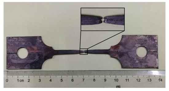 Figure 13 shows the photograph of the fractured tensile sample of laser-welded B1500HS. By observing the fracture position of the specimen, it can be found that the fracture is V-shaped, which indicates that the FZ cracked first during the tensile process.
