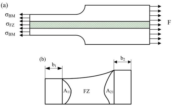 In the previous research, a mixed method has been used by scholars to calculate the tensile properties of the weld joint [25,26,27]. In this study, the flow stress-strain curves of FZ at high temperatures were calculated by the mixture method. The mechanical model of B1500HS TWB under tensile test is shown in Figure 14a.