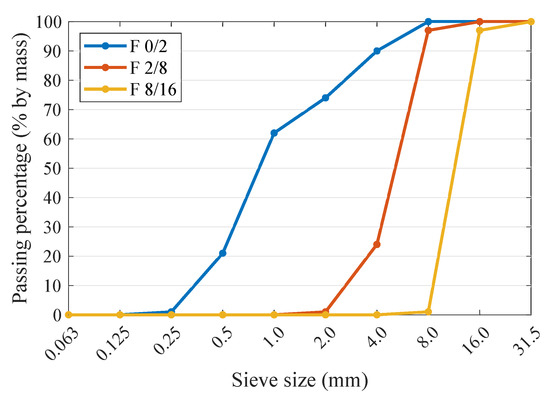 The particle size distribution was selected using the iterative method described by Kuczyński [33,34]. When composing the particle size distribution from several different aggregate fractions, they were put together in such a way as to ensure the greatest possible tightness, with the lowest possible water demand.