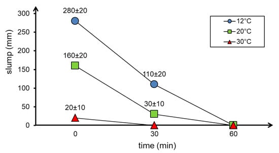 Figure 3 shows the slump depending on the time of the test and the ambient temperature at which the concrete mixture was prepared from ingredients that had previously obtained the same temperature as the ambient temperature. It is clear that the concrete mixture preparation temperature in the range from 12 °C to 30 °C has a significant impact on the consistency. At 30 °C, immediately after mixing the ingredients, a minimum slump (20 mm) is observed, while at 12 °C this value is as high as 280 mm, which is beyond the applicability range of this test method.