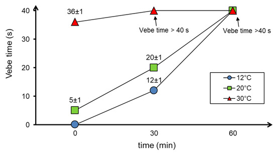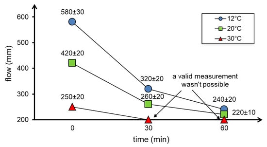 Similar results were obtained using the flow table test and the Vebe test. The flow diameters and Vebe time depending on the temperature as well as the time of the test are shown in Figure 4 and Figure 5, respectively.