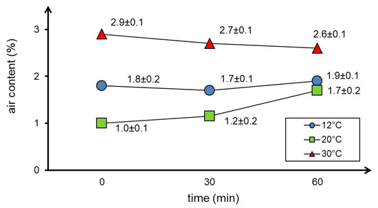 As shown in Figure 6, the air content in the concrete mixture generally increases with the mixture temperature and does not change significantly over time. It should be noted that the results obtained at 30 °C may be unreliable as the consolidation of concrete mix was difficult at this temperature.