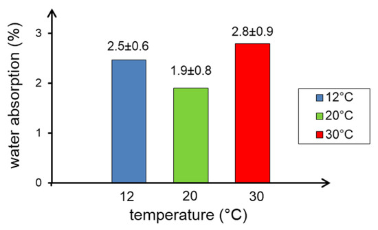 The results of the water absorption tests of the samples of concrete cured at different temperatures showed that in all cases the obtained values were at a very low level. The least absorbent is the concrete cured at 20 °C, and the largest is the concrete cured at 30 °C (Figure 7), however the presented differences should be considered as small. In addition, at elevated temperatures the water absorption rate increases more than at the lower curing temperature (12 °C). Similar results were obtained by the authors of the paper [37] in testing mortars.