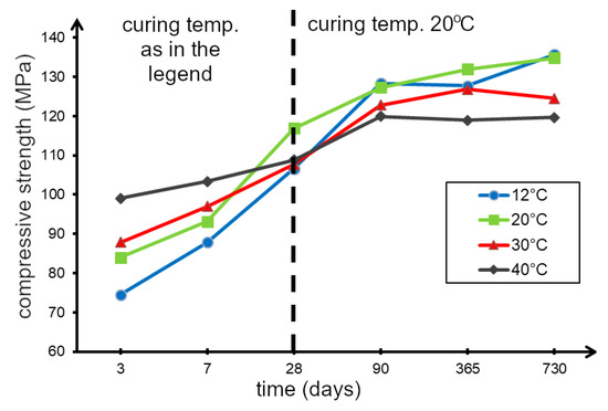 After 28 days, the highest compressive strength was achieved by the concrete maturing at lower temperatures. At the age of two years, concrete produced at temperatures of 12, 20, 30, and 40 °C reached compressive strengths of 135.6, 134.8, 124.5, and 119.7 MPa, respectively.