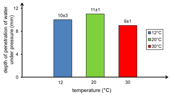 The results of penetration depth tests of the concrete samples cured at 12 °C, 20 °C and 30 °C showed that no significant differences were observed in the values of this parameter (Figure 9) which is in the 9–11 mm range. The above shows a very high tightness of the tested concrete and indicates a properly selected composition of the concrete mixture, including a tight particle size distribution.