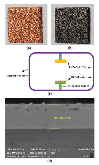 Before the Ti-Zr-V-Hf NEG coating deposition, the OCMF substrates with a pore size of 0.1 mm were ultrasonically rinsed in acetone and then in absolute ethyl alcohol for 10 min, respectively. Then the TiHf film coatings were deposited on the OCMF substrates by DC sputtering using Ar gas with a purity of 99.999%. The target material was made of Ti, Zr, V and Hf elements with an atomic number ratio of 1:1:1:1. Typical film deposition parameters were a working pressure of 0.5 Pa, a discharge power of 280 W, a gas flow of 20 Sccm, a sputtering rate of 1.39 nm/s and a base pressure of 5.8 × 10−4 Pa. The temperature of the sample disk increased from 25 °C to 40 °C during Ti-Zr-V-Hf non-evaporable getter film deposition. Three Ti-Zr-V-Hf non-evaporable getter films with open-cell copper metal foam substrate samples prepared by the same film deposition parameters were used for the same tests, such as the SEM tests. The photos of the OCMF substrates before and after film deposition are shown in Figure 1a,b. The model of the DC sputtering deposition machine is shown schematically in Figure 1c. Silicon wafers were used to evaluate the thickness of the Ti-Zr-V-Hf NEG coatings on the porous OCMF substrates, which was 2.48 μm, as shown in Figure 1d.