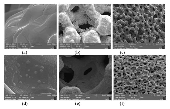 The surface morphologies of OCMF substrates with a pore size of 0.1 mm are shown in Figure 2a–c with different magnifications. The wave-like structures, as shown in Figure 2a, appeared on the surface of the OCMF substrates. At the same time, island-like structures formed on the surface of the Ti-Zr-V-Hf film-coated OCMF substrates, as manifested in Figure 2d with the SEM image magnifications of 30,000×, which may have induced the roughness increase compared to that of the uncoated OCMF substrates in Figure 2a.