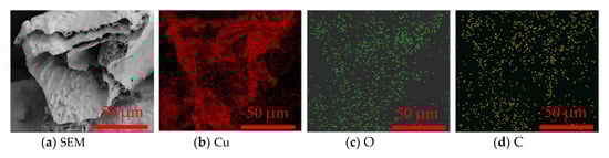 To analyze the element distributions of the OCMF substrates before and after film deposition, SEM and EDS analyses were performed. A cross-section SEM image of the OCMF substrates is shown in Figure 3a. The EDS results indicated the existence of three elements (Cu, C and O) on the cross-section of the OCMF substrates (Figure 3b–d). This may indicate that the OCMF substrate surface was partially oxidized during air exposure.