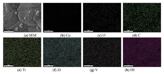 The surface SEM images of the Ti-Zr-V-Hf film with OCMF substrates (a) and corresponding Cu (b), O (c), C (d), Ti (e), Zr (f), V (g) and Hf (h) distribution maps. Scale bar 2 μm.